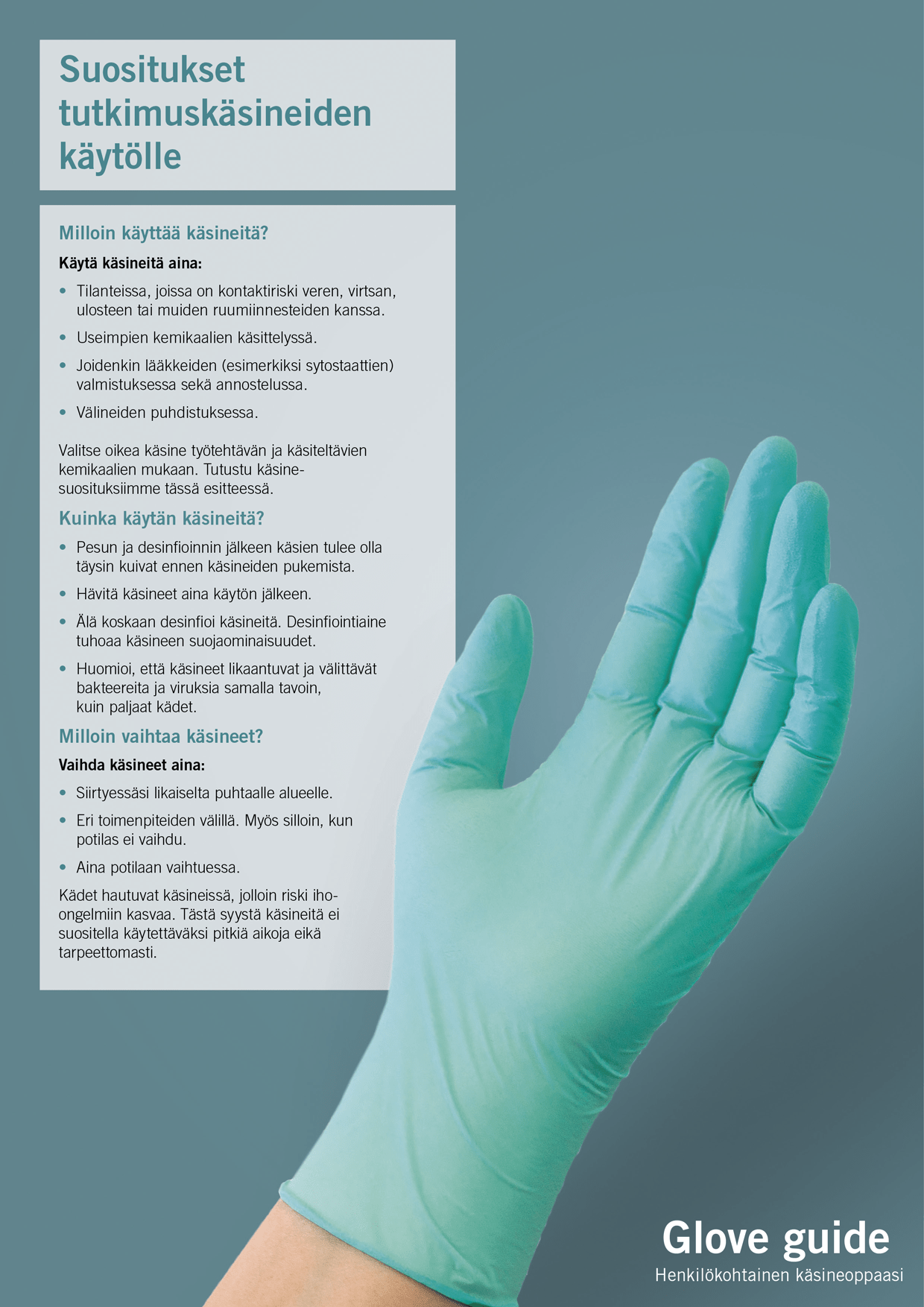 Valitsemalla omiin tarpeisiisi soveltuvat enintään 7 käsinettä, voit tulostaa käsineohjeen esimerkiksi vastaanottohuoneeseen tai osaston varastotilaan helpottamaan käsinevalintaa. Huomioithan, että oppaassa esitetyt tuotenumerot ovat valmistajan tuotenumeroita, jotka ovat samat kuin käsinepakkauksissa.